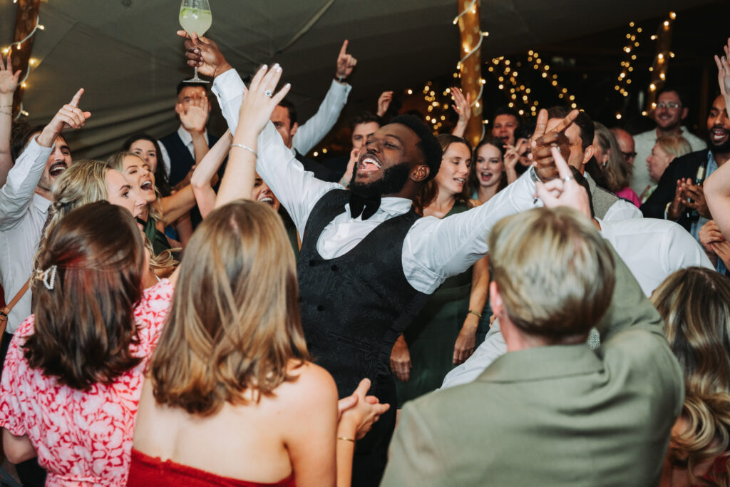 Wedding photo showing a still couple while guests walk through the frame creating motion blur.